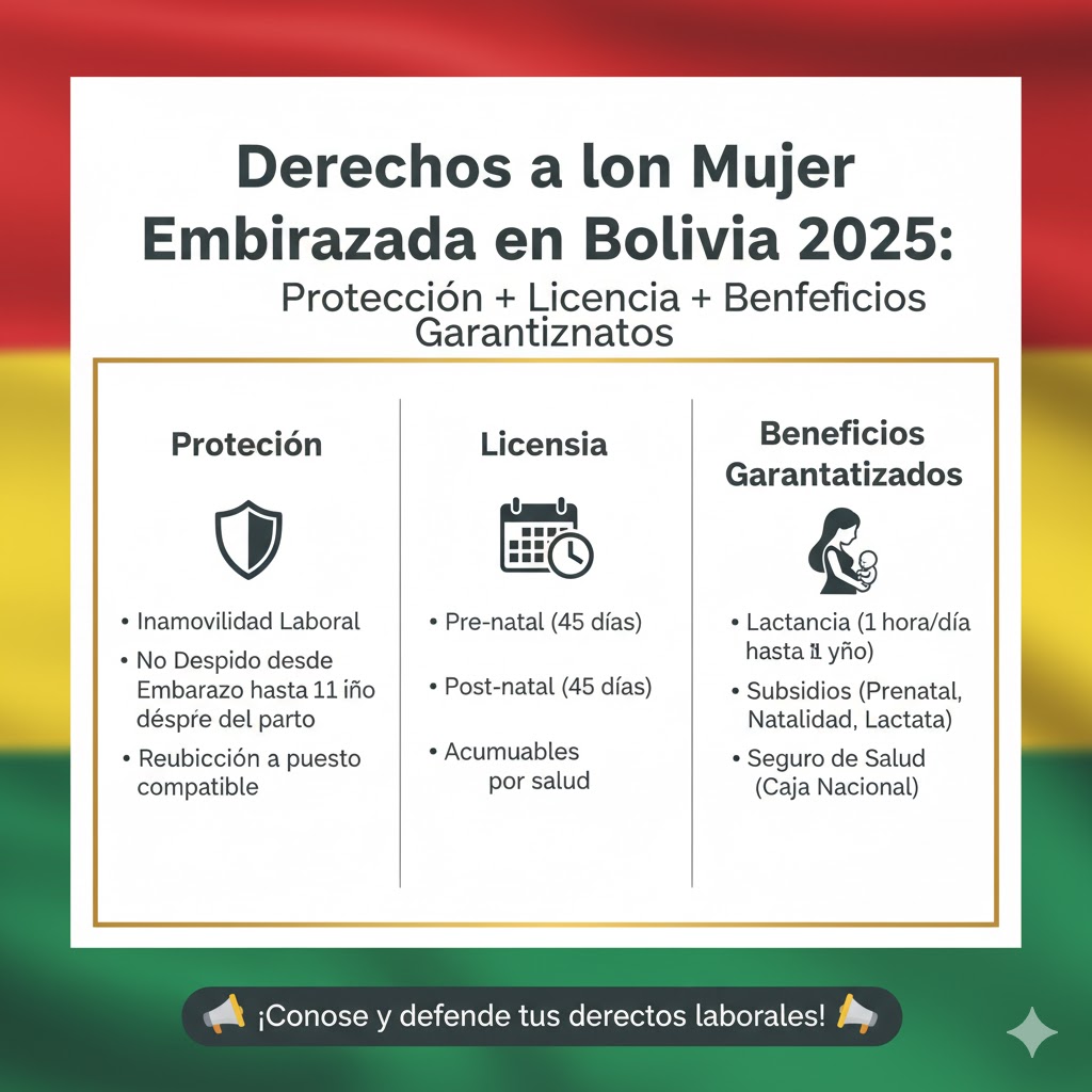 Durante el embarazo y maternidad en Bolivia, tienes máxima protección legal. NO pueden despedirte, recibes 120 días de licencia paga (45 prenatales + 75 posnatales), permiso para amamantar, y todos tus beneficios continúan acumulándose.